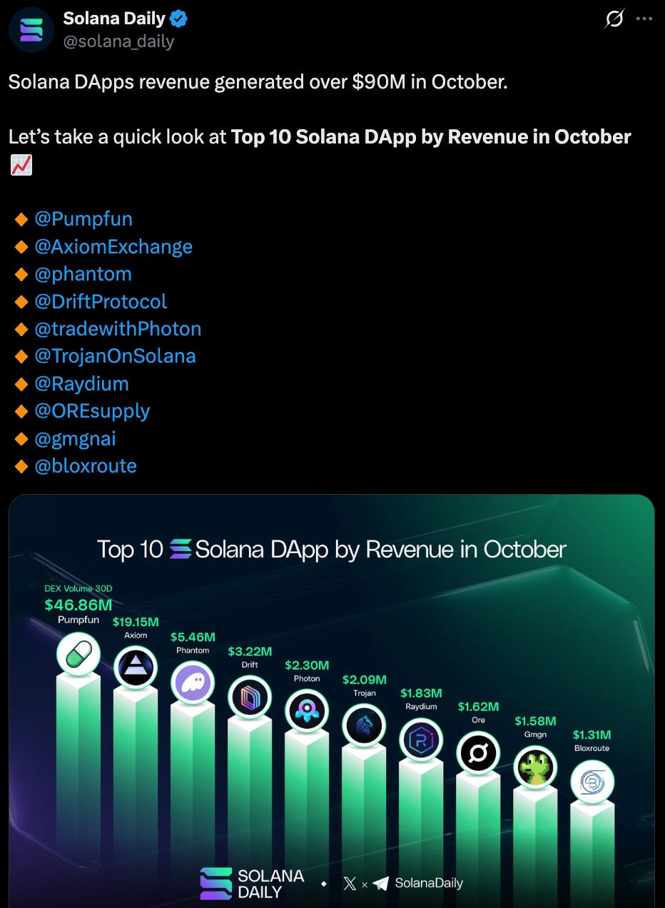 October saw over $90M in revenue flow through Solana dApps - with Pumpfun and Axiom leading the charge.