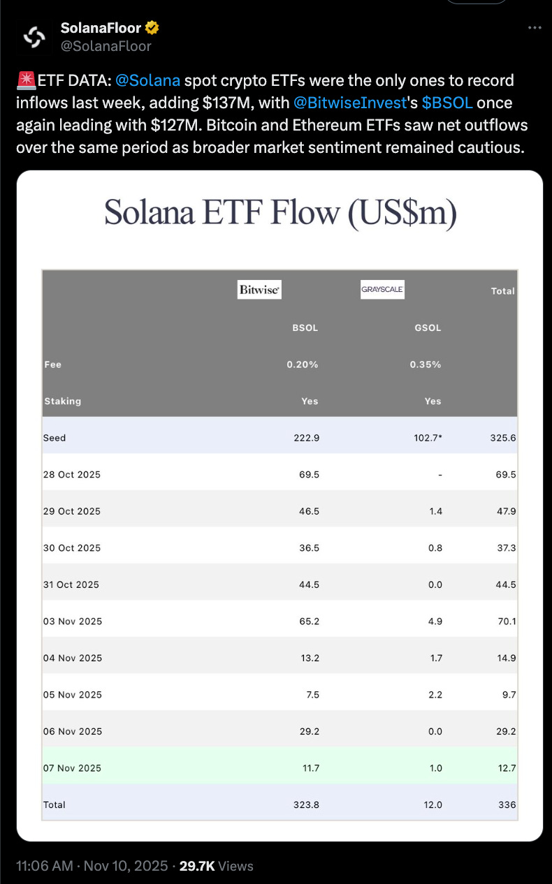 ETF data: Solana spot ETFs were the only ones recording inflows this week: +$137M total, led by Bitwise’s $BSOL at $127M. Meanwhile, Bitcoin and Ethereum ETFs saw net outflows as market sentiment cooled.