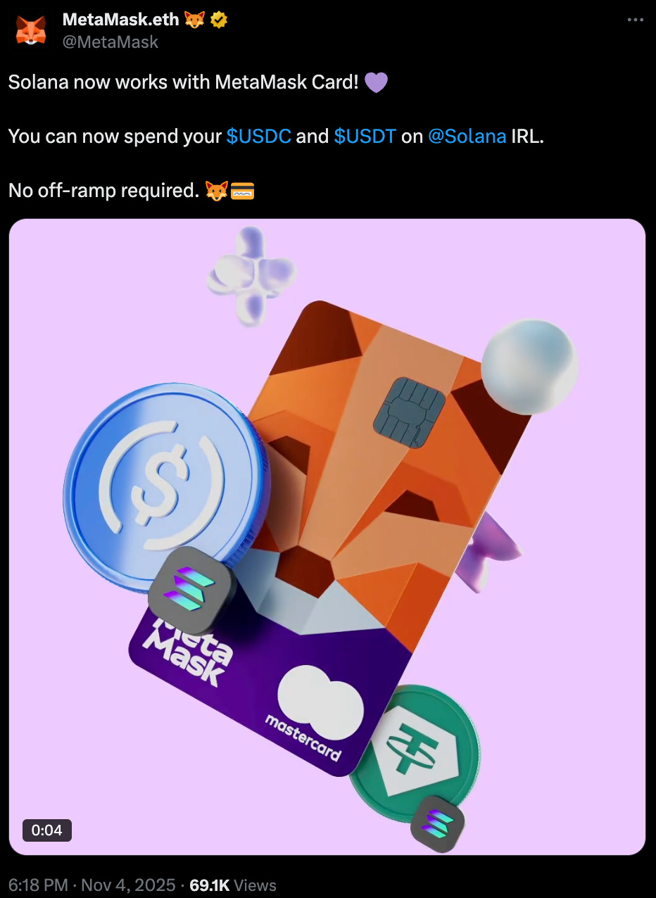 Welcome, MetaMask Card: users can now pay directly with $USDC and $USDT on Solana.