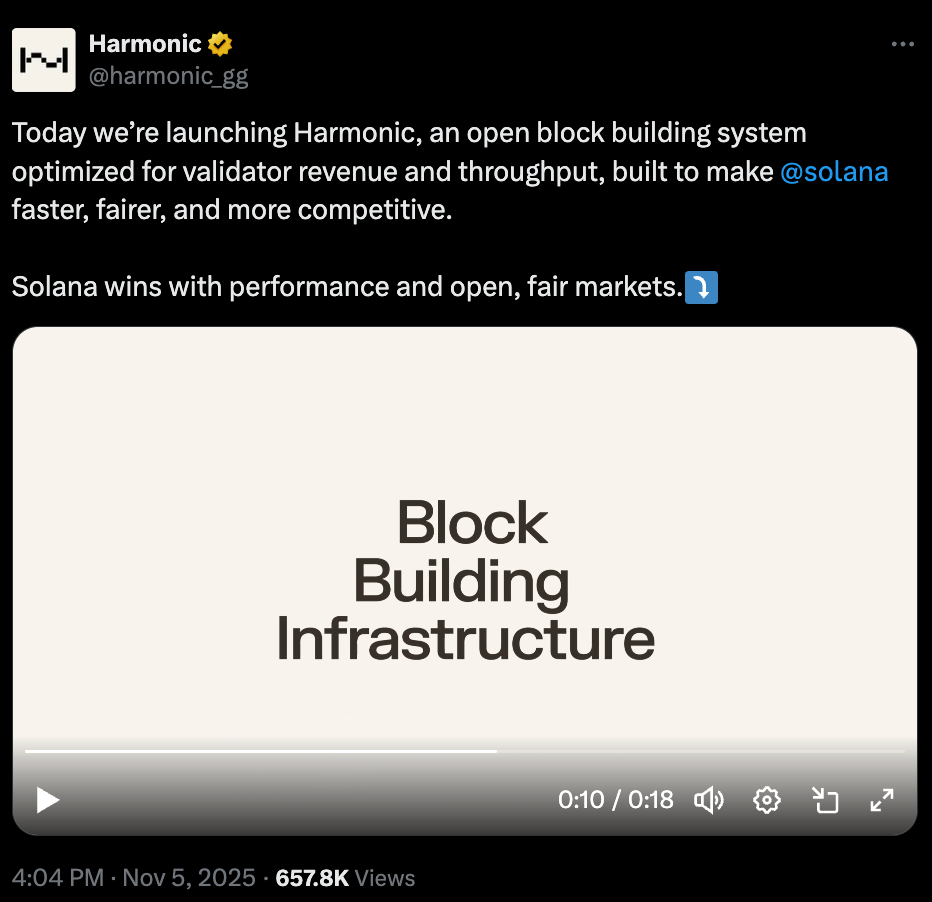 Harmonic debuts on Solana: a next-gen block-building engine driving innovative market structures and on-chain competition with CEXs.