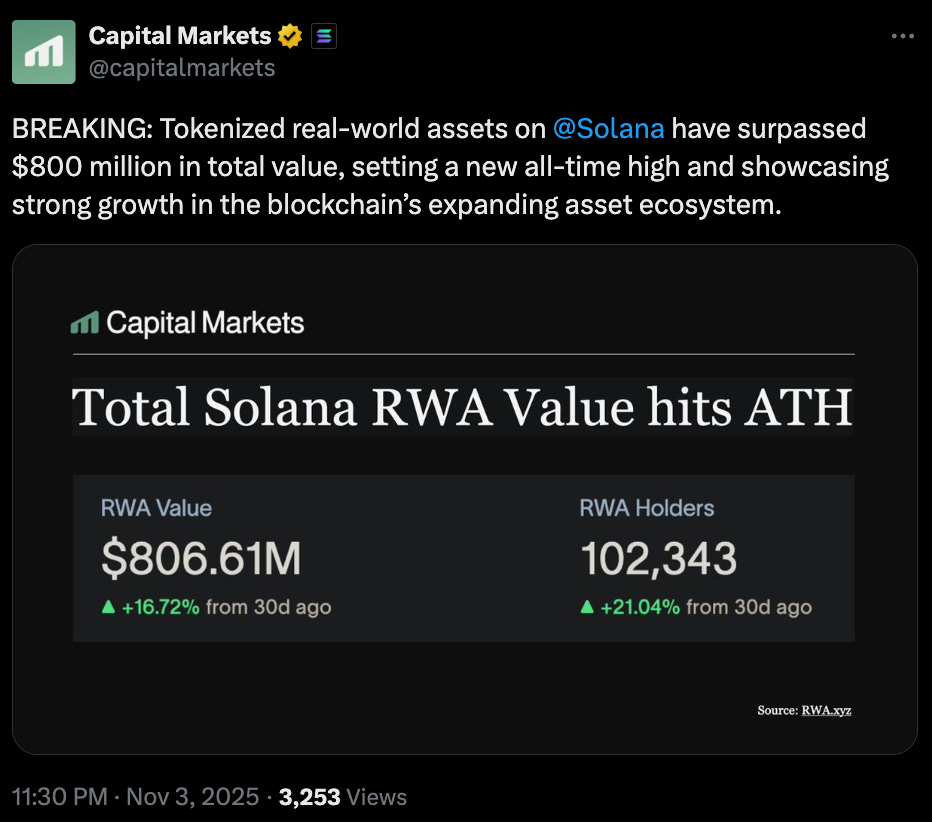 Tokenized RWAs on Solana break a new record, climbing past $800M TVL.