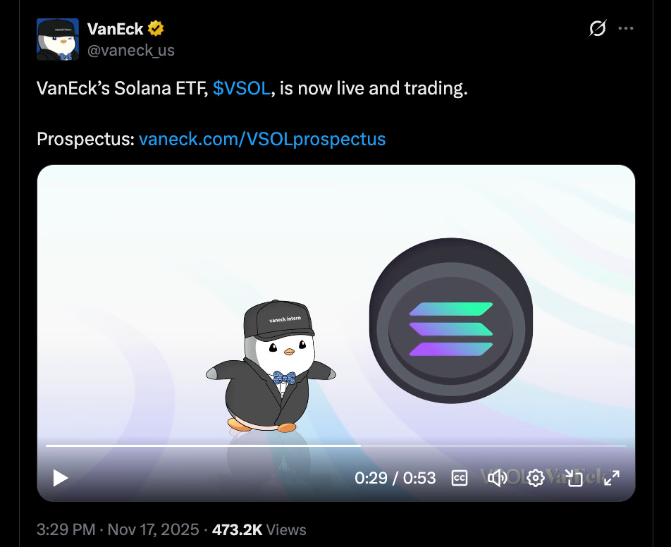 VanEck’s Solana ETF, $VSOL, is now live and trading.