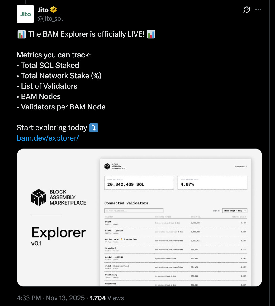 Jito releases BAM Explorer, a Block Assembly Marketplace that enables transparent, app-driven transaction execution.